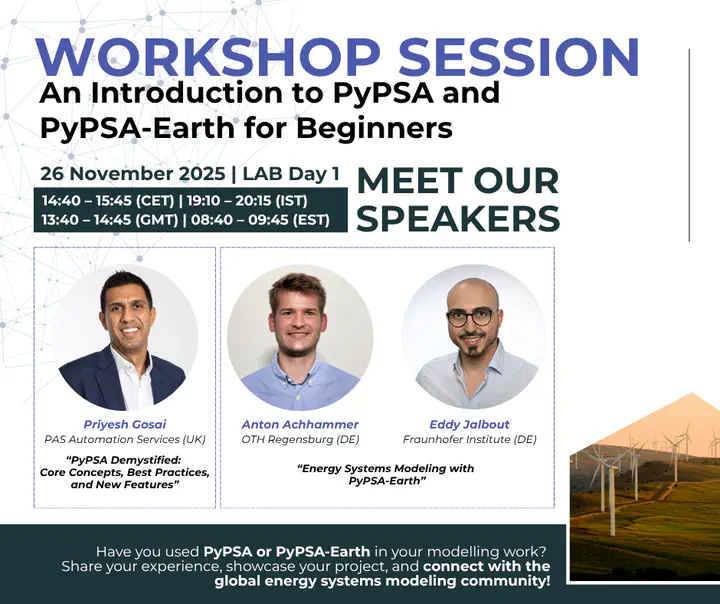 The PyPSA Meets Earth Lab is an interactive online event bringing together the global PyPSA community to collaboratively advance open-source energy system modelling. Participants will work hands-on with the PyPSA framework, contribute to improving datasets, workflows, and documentation, and exchange ideas for future development. The event combines hackathon-style sessions, community discussions, and technical tutorials, aiming to strengthen collaboration across research institutions and practitioners working on open, transparent, and reproducible energy system analysis. Organized by the PyPSA community, the event highlights the role of open science for global decarbonization pathways and sustainable energy transitions.